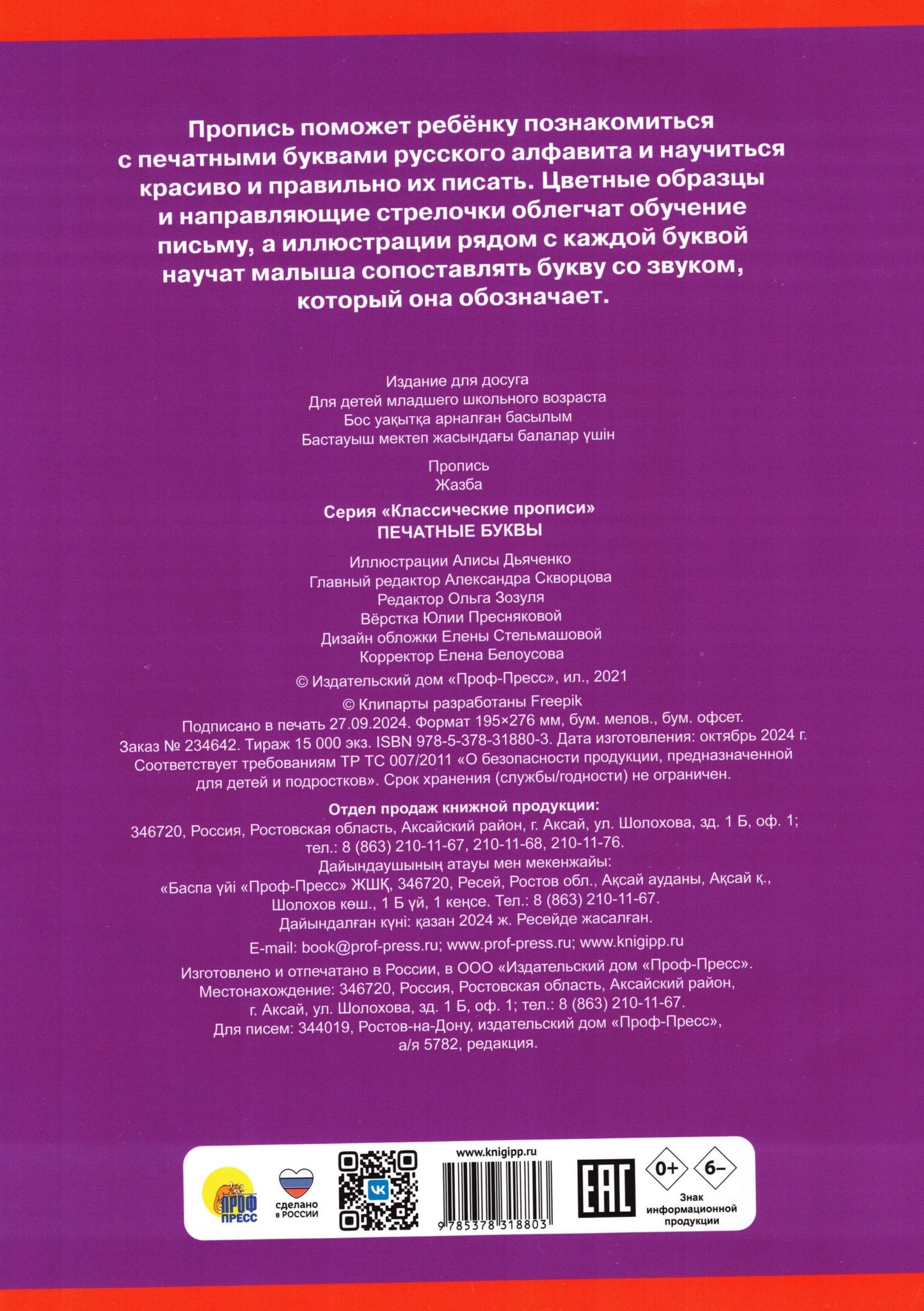 Пропись поможет ребёнку познакомиться с печатными буквами русского алфавита и научиться красиво и правильно их писать. Цветные образцы и направляющие стрелочки облегчат обучение письму, а иллюстрации рядом с каждой буквой научат малыша сопоставлять букву со звуком, который она обозначает.