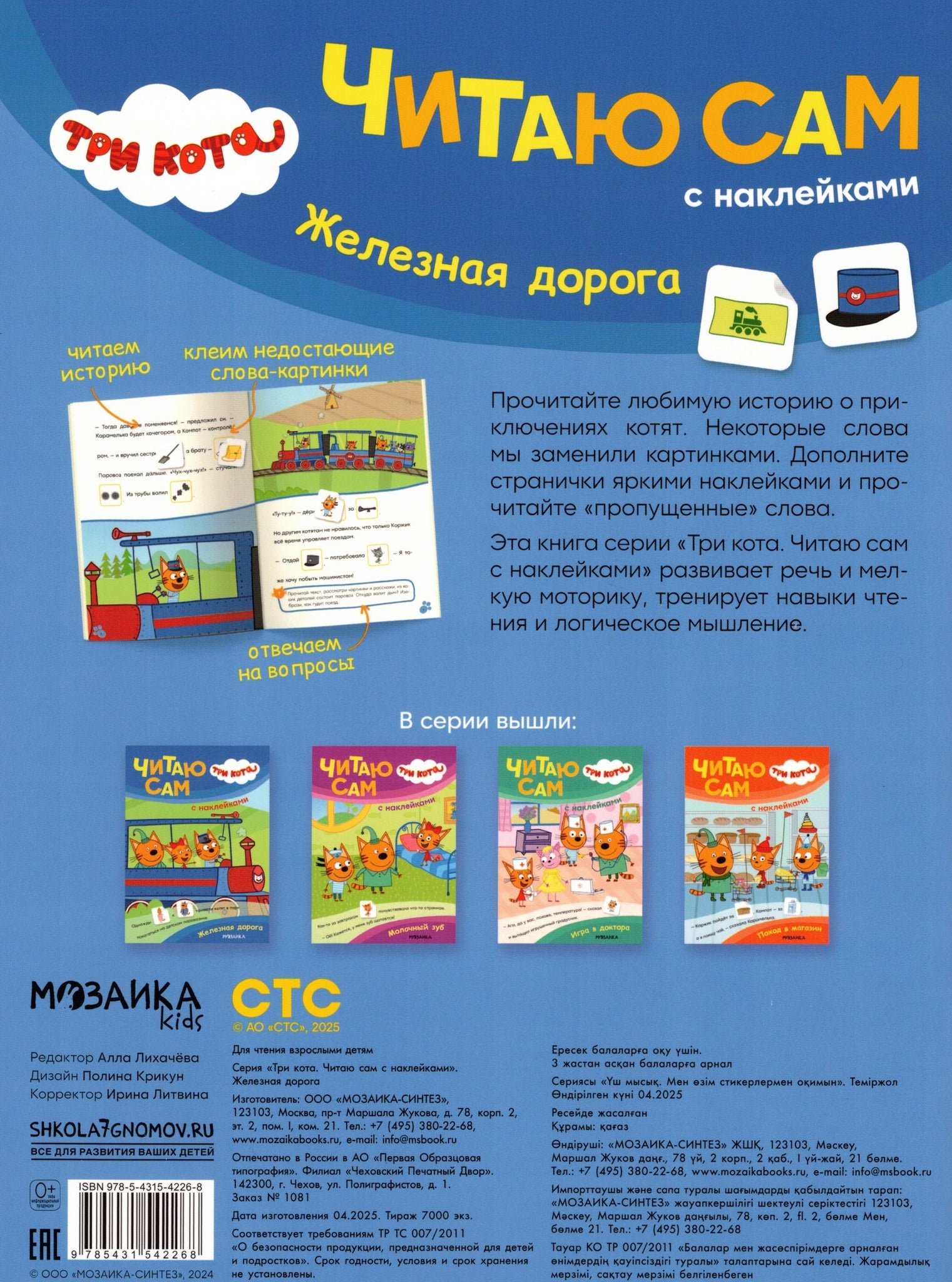 Книга «Железная дорога» серии «Три кота. Читаю сам с наклейками» идеально подойдет для обучения чтению, развития речи, мышления и мелкой моторики вашего малыша. Некоторые слова заменены картинками.