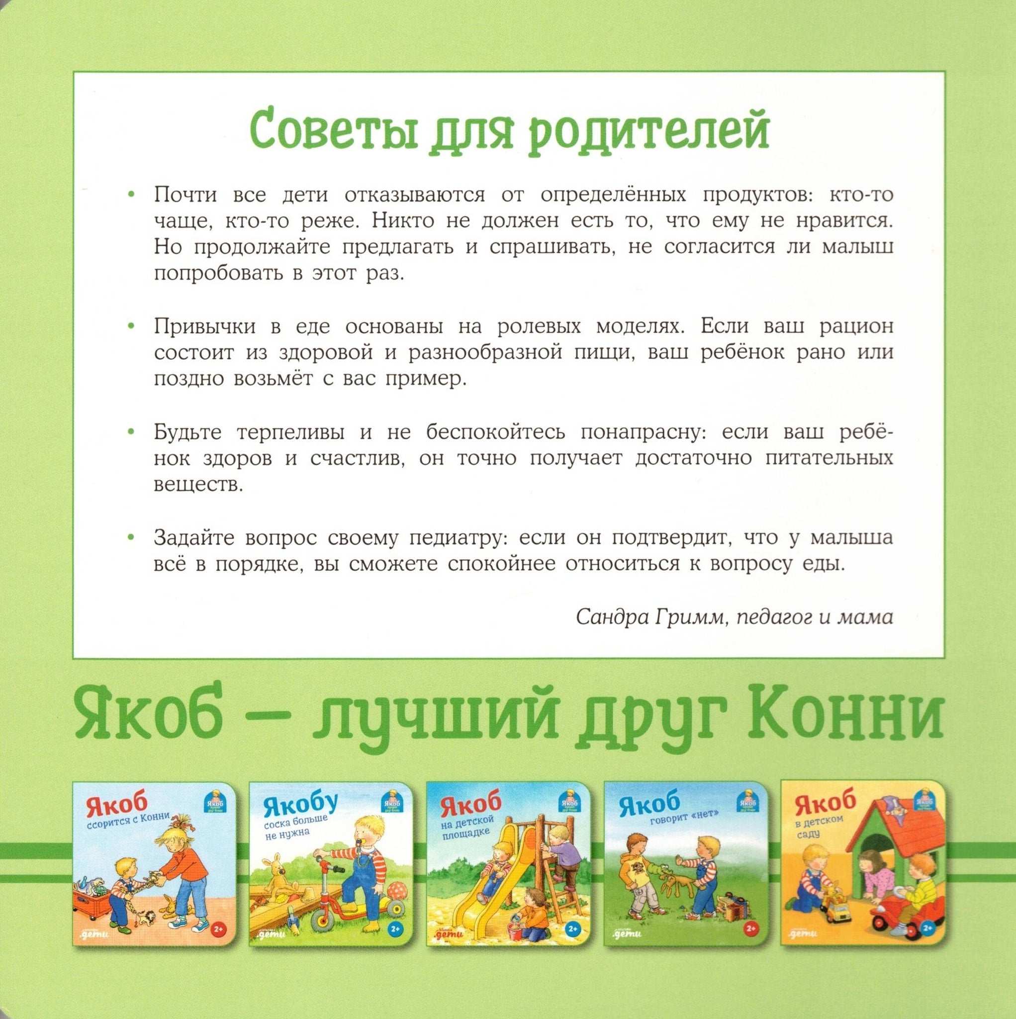 Как и у любого ребенка, у Якоба есть любимые блюда, например, огурцы. Но ничего нового он пробовать не хочет. Вдруг не понравится. Но однажды папа предлагает игру: он пробует банан, а Якоб — помидор. И Якоб откусывает маленький кусочек...Вместе с Якобом ваш малыш: поймет, что пробовать новое — не страшно; станет уважать вкусы других людей; научится прислушиваться к советам взрослых.Серия «Якоб — лучший друг Конни». Долгожданные книги о младшем братике Конни — Якобе.Истории помогут развивать важные навыки и полезные привычки, необходимые каждому ребенку. Простые и запоминающиеся рассказы небольшого объема удобно читать в дороге или перед сном: на это уйдет не больше 5 минут и малыш не успеет заскучать и отвлечься.«Мама глазам своим не верит, что Якоб ест помидоры. Но сама она не хочет есть. Мама не любит сыр. Папа с Якобом смеются и хором кричат: — Надо попробовать»!Плотные картонные страницы, удобный формат для малышей от 2 лет.Для мальчиков и девочек от 2 лет.