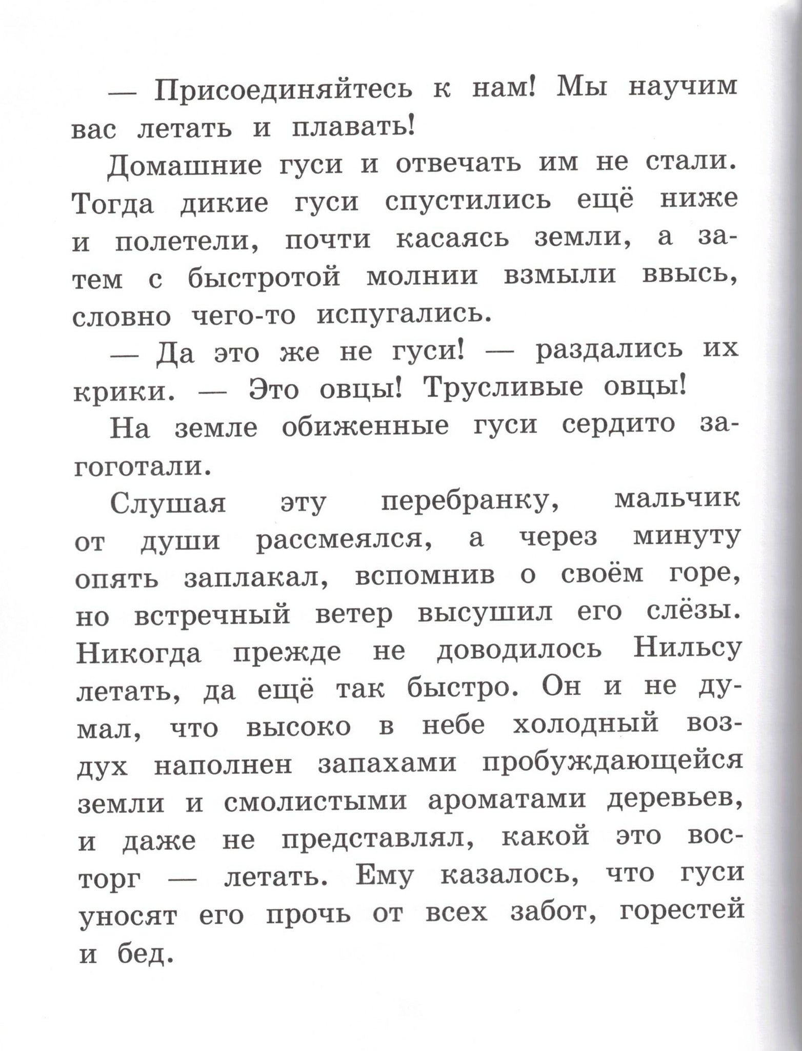 Сельма Лагерлёф — известная шведская писательница, первая женщина, получившая Нобелевскую премию по литературе. Сказочная манера писательницы сформировалась благодаря народным легендам и преданиям, которые рассказывали маленькой Лагерлёф, прикованной болезнью к кровати, её бабушка и тётя. Будучи по образованию учителем, С. Лагерлёф смогла создать не просто сказочную, но и полезную для воспитания и развития ребёнка книгу.Читая об увлекательном путешествии заколдованного мальчика Нильса и гуся Мартина, ребёнок узнает много интересного о географии, культуре, природе и животных. А ещё — вместе с героями будет учиться доброте и честности. Сразу после выхода эта сказка стала самым популярным произведением в Скандинавии. И сегодня она продолжает увлекать маленьких читателей по всему миру.Текст приводится без сокращений, с большим количеством ярких иллюстраций Игоря Панкова.