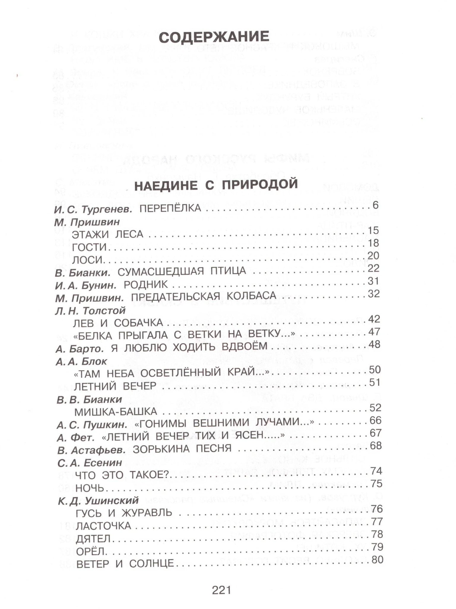 В сборник  включены стихи, рассказы, сказки, рекомендованные для внеклассного чтения в 4 классе, а также для чтения в кругу семьи. Они вводят школьников в мир большой литературы, помогают формировать умения и навыки чтения, тяги к нему, развитию интересов и кругозора, нравственных качеств. В сборнике четыре раздела: "Наедине с природой", "Мифы русского народа", "Путешествие в сказку", "Смешинки". Среди авторов как классики русской литературы И.Тургенев, И.Бунин, А.Блок, С.Есенин, так и современные писатели и поэты.