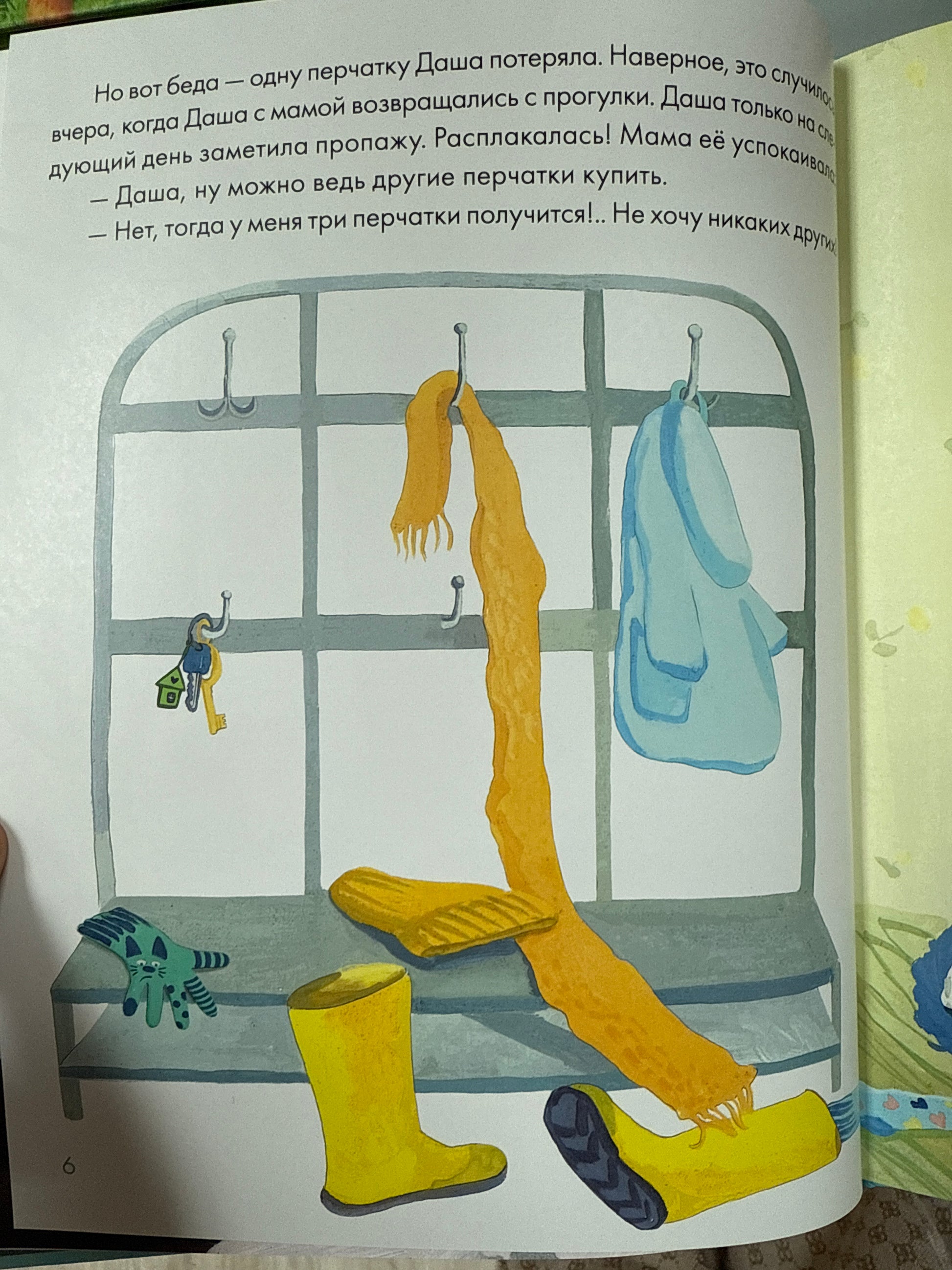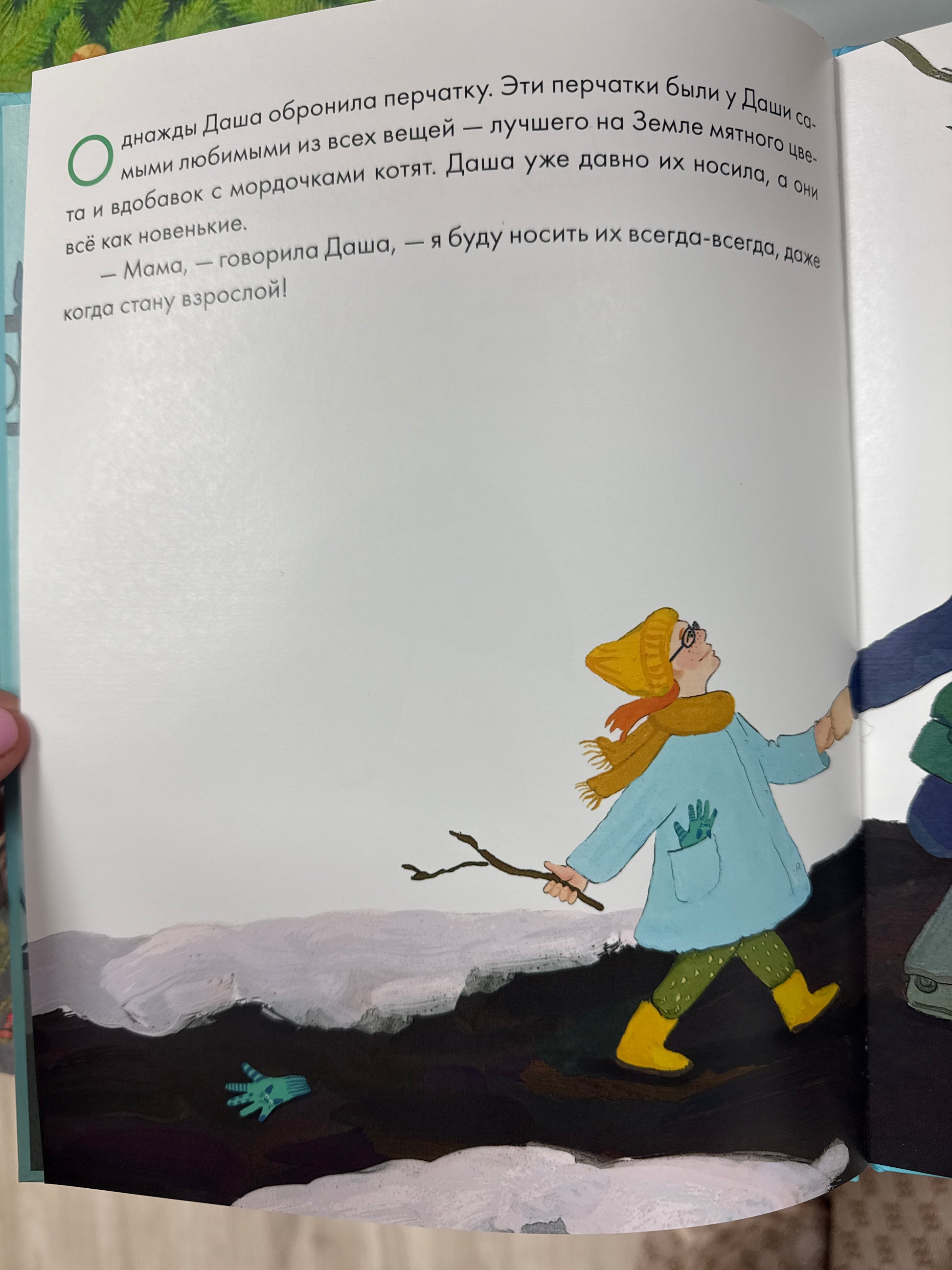 Даша очень любила свои перчатки цвета мяты с мордочками котят. Однажды девочка где-то обронила одну из них. Перчатка-Потеряшка загрустила и совсем отчаялась, думая, что уже не вернётся к Даше. Вдруг какой-то мальчишка схватил её и запустил из рогатки на верхушку дерева. Неожиданно Потеряшка почувствовала, что её сжимает чей-то большущий клюв...Для детей дошкольного возраста.
