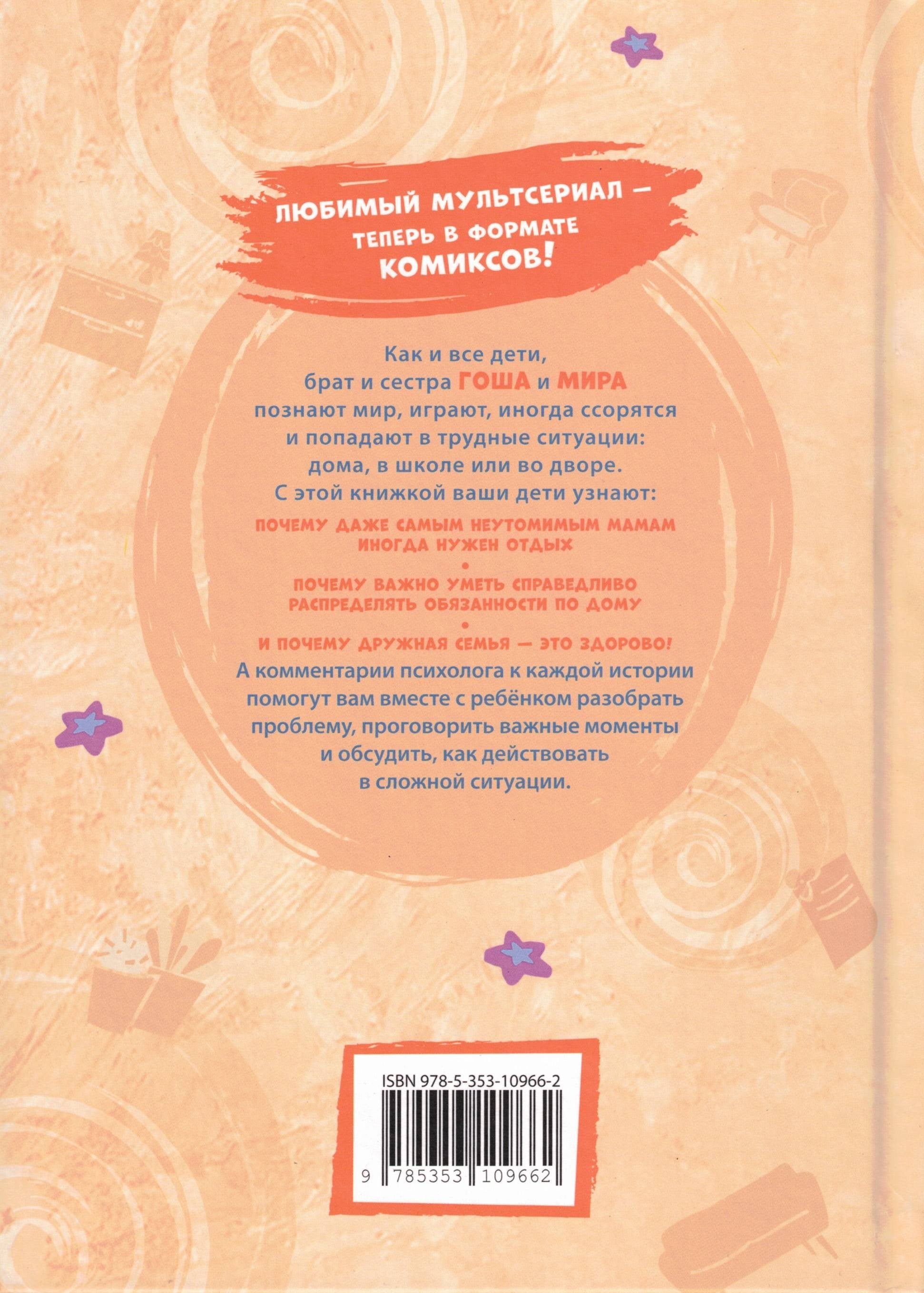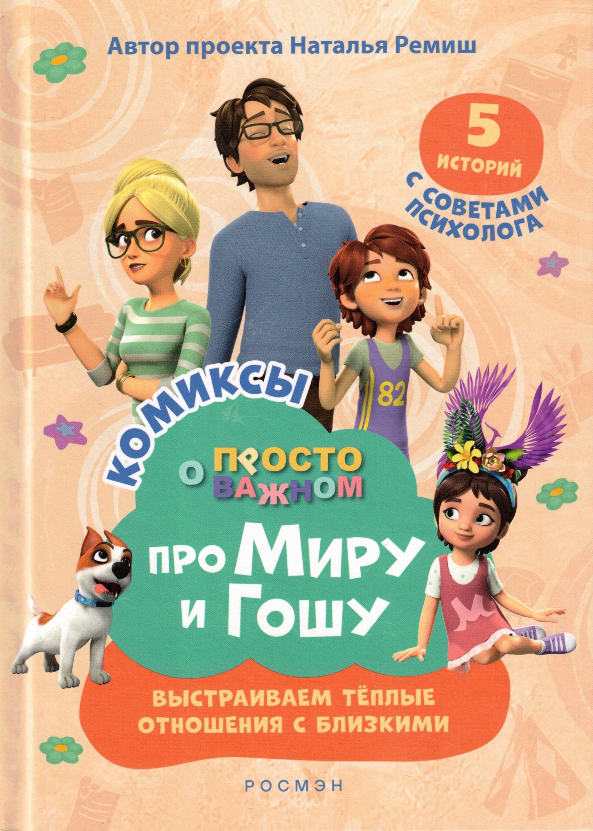 The comic book series "About Mira and Gosha" features the characters from the beloved animated series learning to interact with the world around them and themselves. Each comic contains five stories connected by a single theme: managing emotions, friendship and building personal boundaries, or creating warm relationships with loved ones. Each story ends with commentary from a psychologist. The project was created by writer, journalist, and producer Natalia Remish.