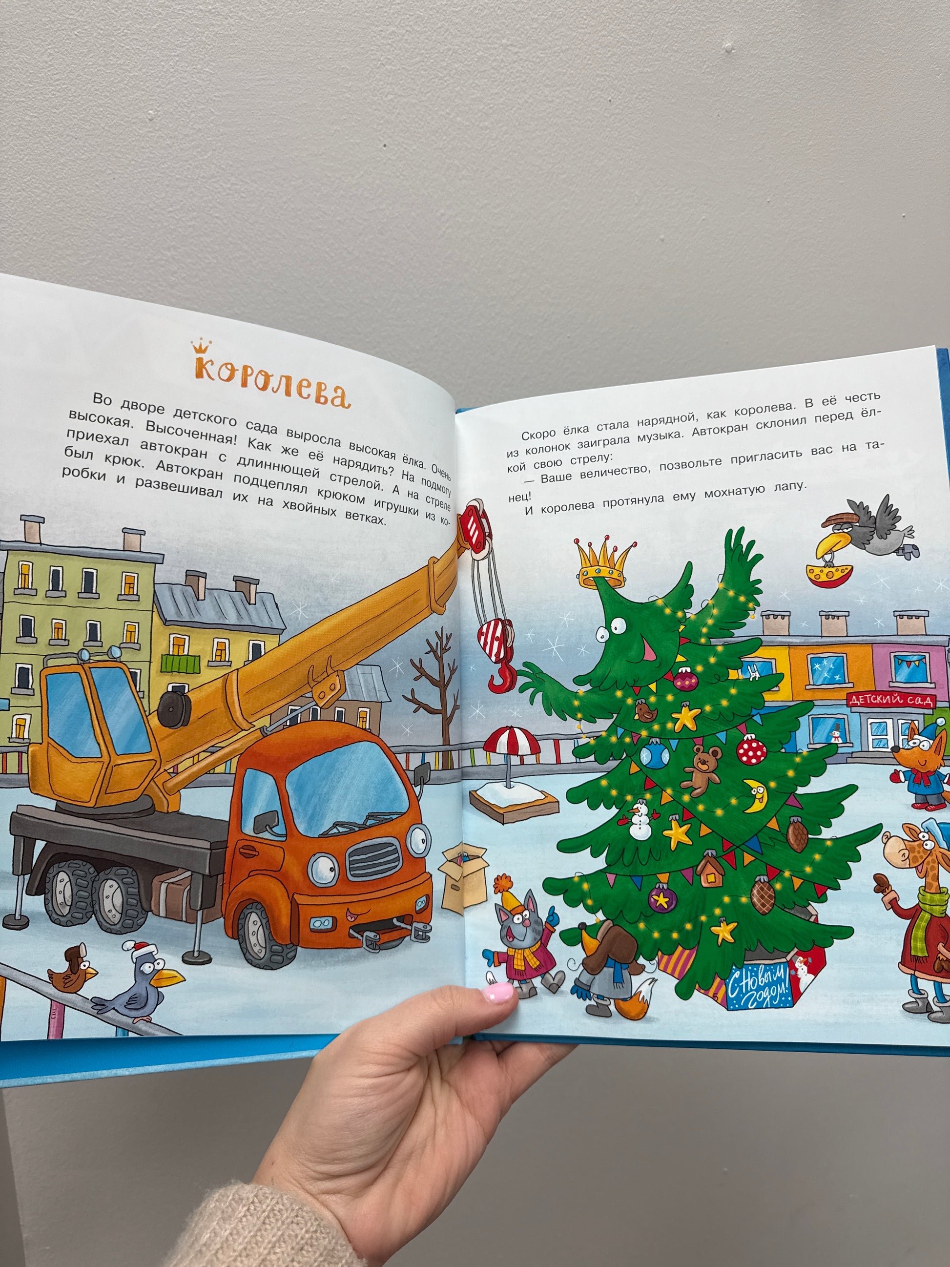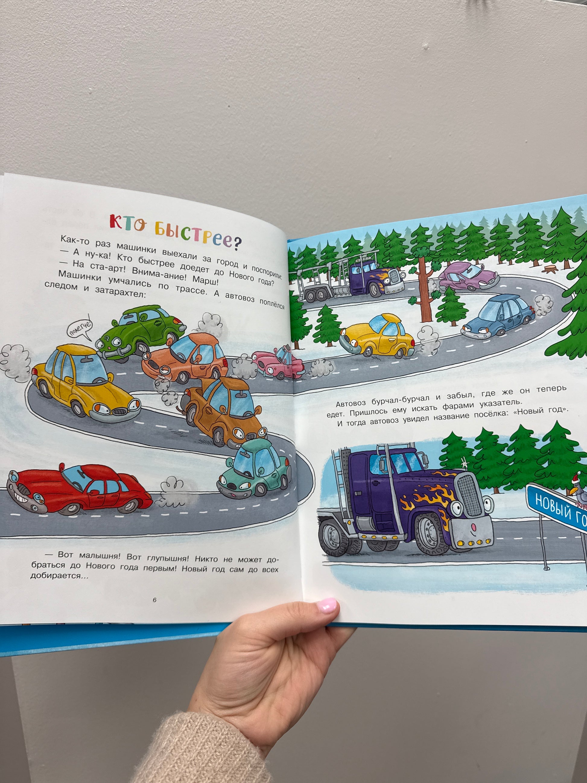 Встречают ли машинки Новый год? Конечно! Почтовая машина возит письма Деду Морозу, автокран украшает елку, а тягач помогает развезти гору подарков. Впереди зимние каникулы — а значит, утренник, маскарад и даже дискотека! Машинки наряжаются в мишуру и — на старт, внимание, марш! Кто быстрее доедет до Нового года?