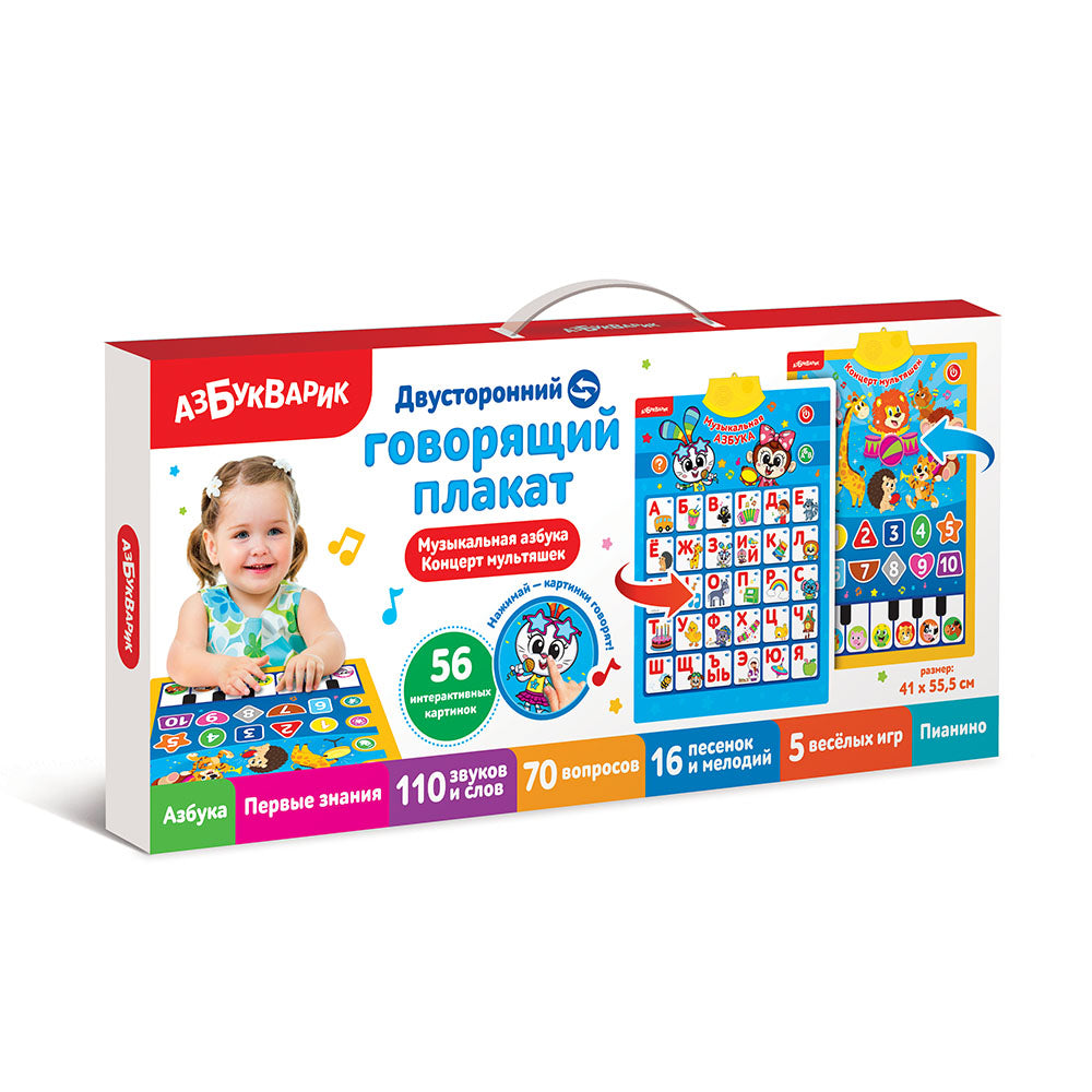 Двусторонний говорящий плакат станет незаменимым помощником для родителей. Азбука и первые знания, герои известных мультиков, 16 песенок и мелодий, 5 веселых игр, пианино – всё это поможет провести время и весело, и с пользой.