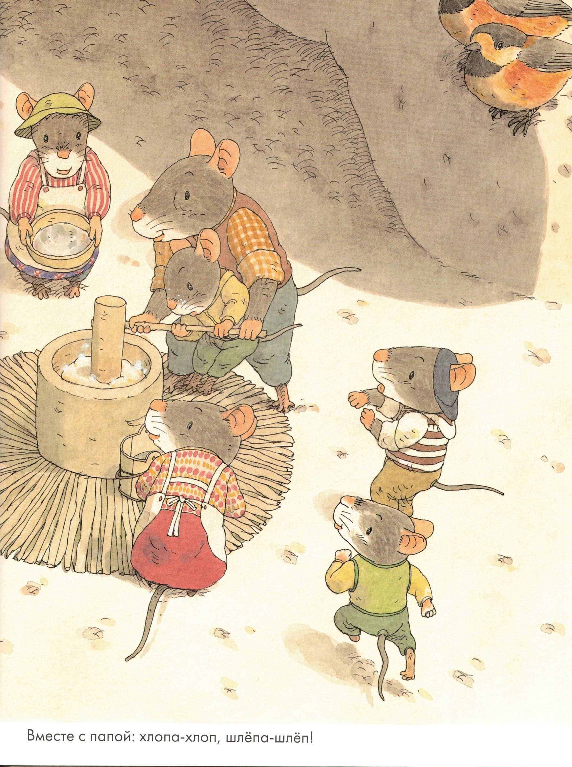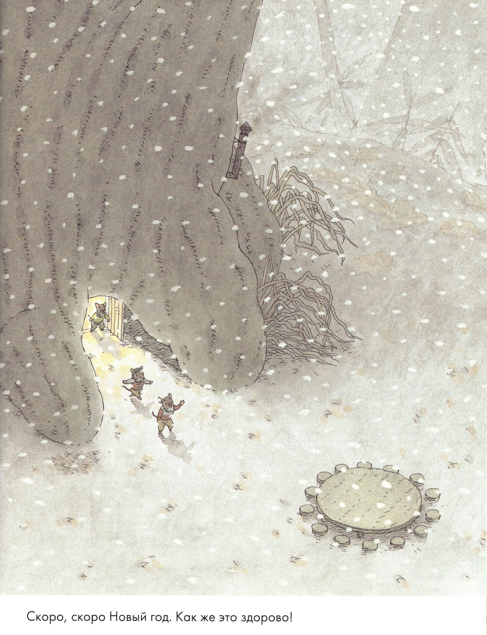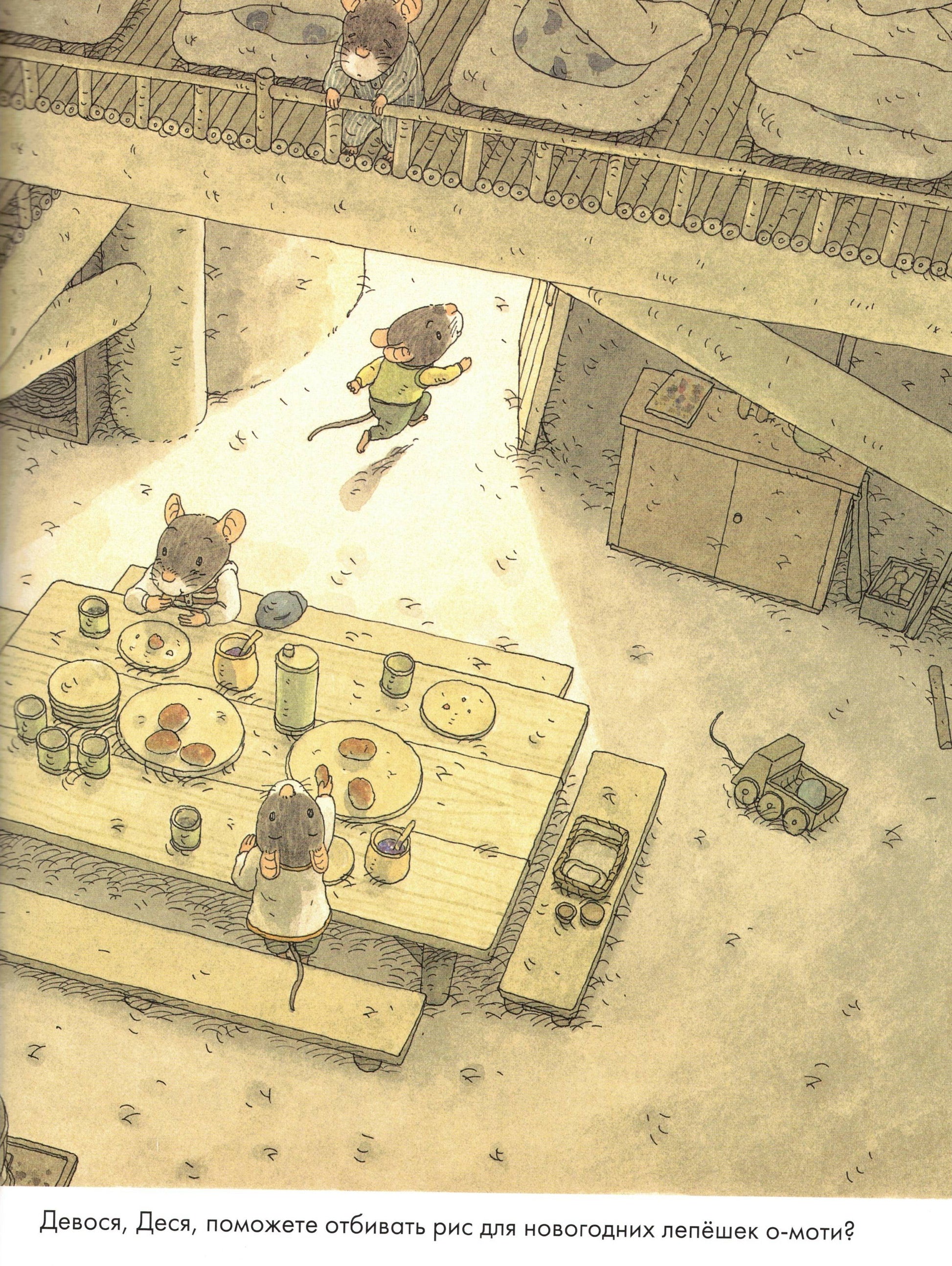 «14 лесных мышей» - очень популярная в Японии и многих европейских странах серия книг о красоте повседневности и о жизни трех поколений мышиного семейства: бабушки, дедушки, мамы, папы и еще десятка мышат. Отличный способ узнать о новогодних традициях Японии – это вместе с большим мышиным семейством, шаг за шаг, приготовить их любимое новогоднее блюдо – рисовые лепёшки. Книги Кадзуо Ивамура напоминают миниатюрные кукольные домики, в которых хочется рассмотреть и потрогать каждую деталь, а каждое маленькое событие наполнено истинно японской философией и любованием жизнью в каждом ее моменте.
