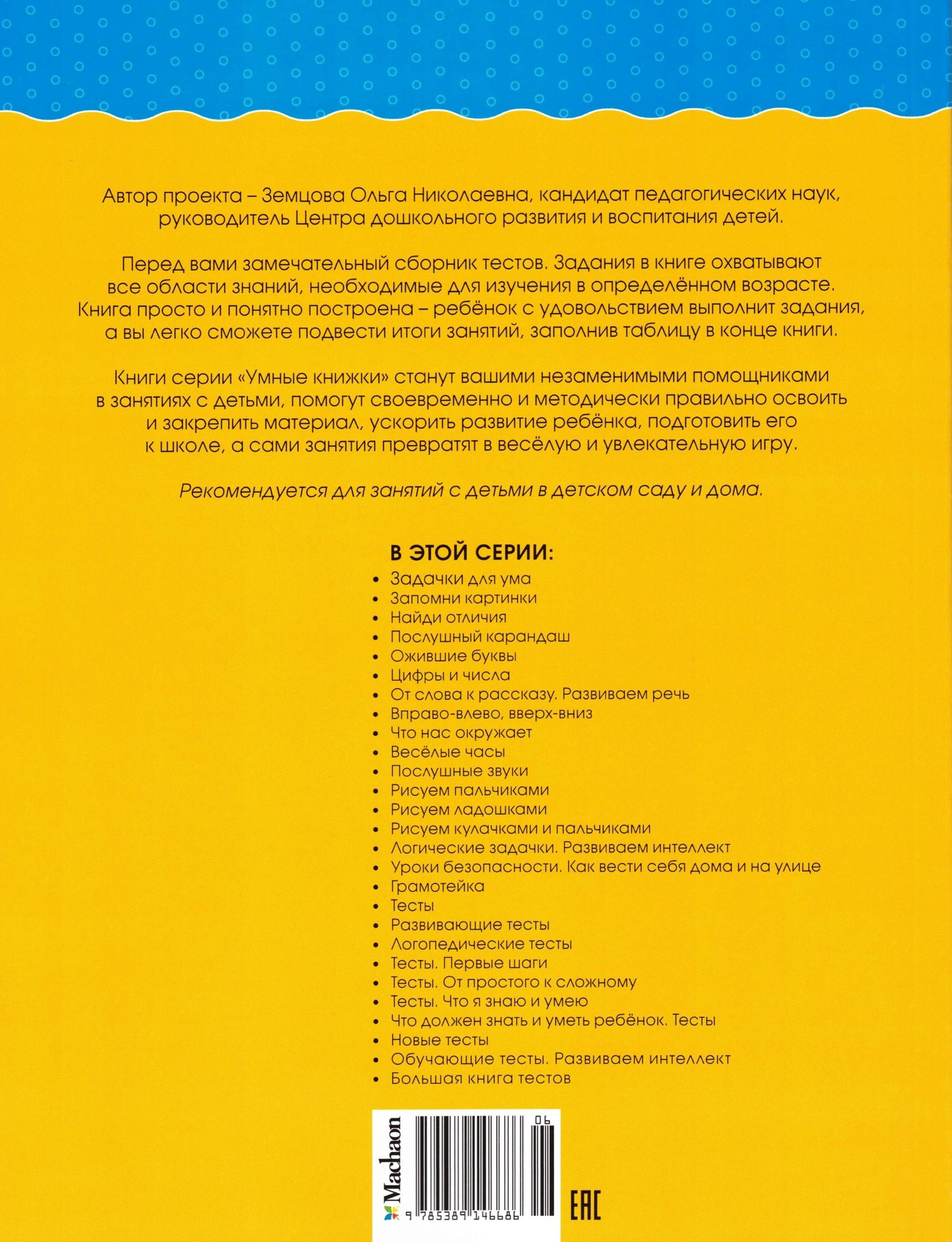 Автор проекта – Земцова Ольга Николаевна, кандидат педагогических наук, руководитель Центра дошкольного развития и воспитания детей.Перед вами замечательный сборник тестов. Задания в книге охватывают все области знаний, необходимые для изучения в определённом возрасте. Книга просто и понятно построена – ребёнок с удовольствием выполнит задания, а вы легко сможете подвести итоги занятий, заполнив таблицу в конце книги.В книгах из серии «Умные книжки» есть всё, что необходимо знать вашему ребёнку. Они станут вашими незаменимыми помощниками в занятиях с детьми, помогут своевременно и методически правильно освоить и закрепить материал, ускорить развитие ребёнка, подготовить его к школе, а сами занятия превратят в весёлую и увлекательную игру.Рекомендуется для занятий с детьми в детском саду и дома.