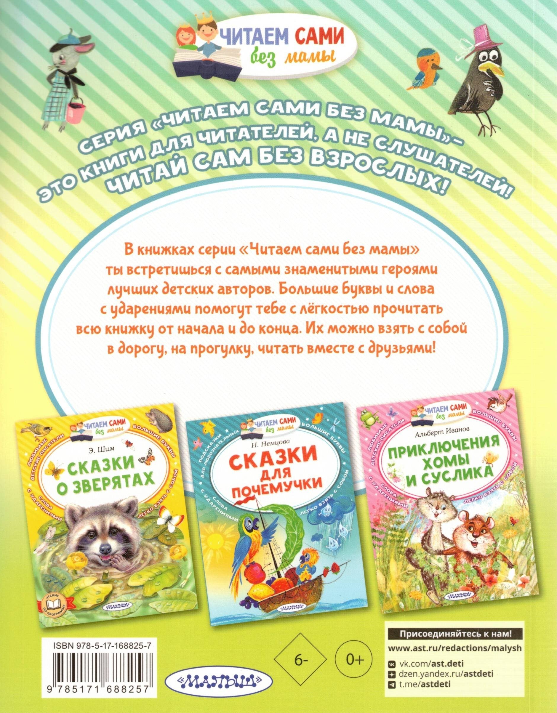 Книги серии «Читаем сами без мамы» — это уникальное собрание золотого фонда отечественной литературы! Сказки, стихи рассказы с красочными иллюстрациями понравятся каждому малышу! Все произведения серии входят в обязательную программу по чтению, а крупный шрифт и ударения помогут ребёнку самостоятельно познакомиться с шедеврами детской мировой литературы. В этой книге юные читатели познакомятся с непоседливыми зверятами, утроят веселый концерт и научаться справляться со страхами. Истории развивают эмоциональный интеллект, учат ребят доброте и дружбе. Лучший подарок для юного читателя!