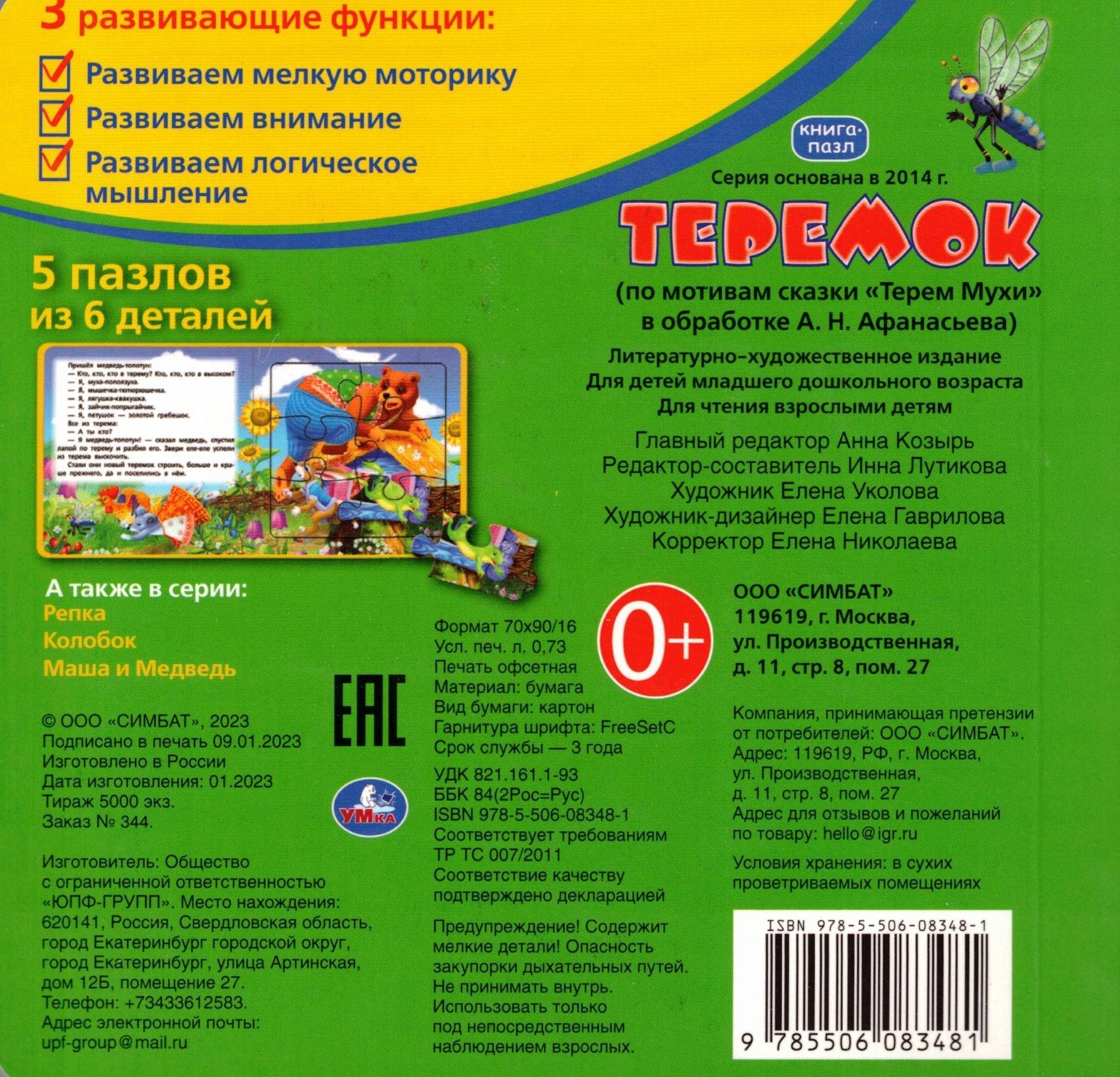 Книга с 5 пазлами «Теремок» ТМ «УМка» станет прекрасным подарком для ребёнка:- формат 2 в 1: читаем сказку и собираем пазлы- 5 вариантов пазлов из 6 деталей- красочные иллюстрации- плотные страницы
