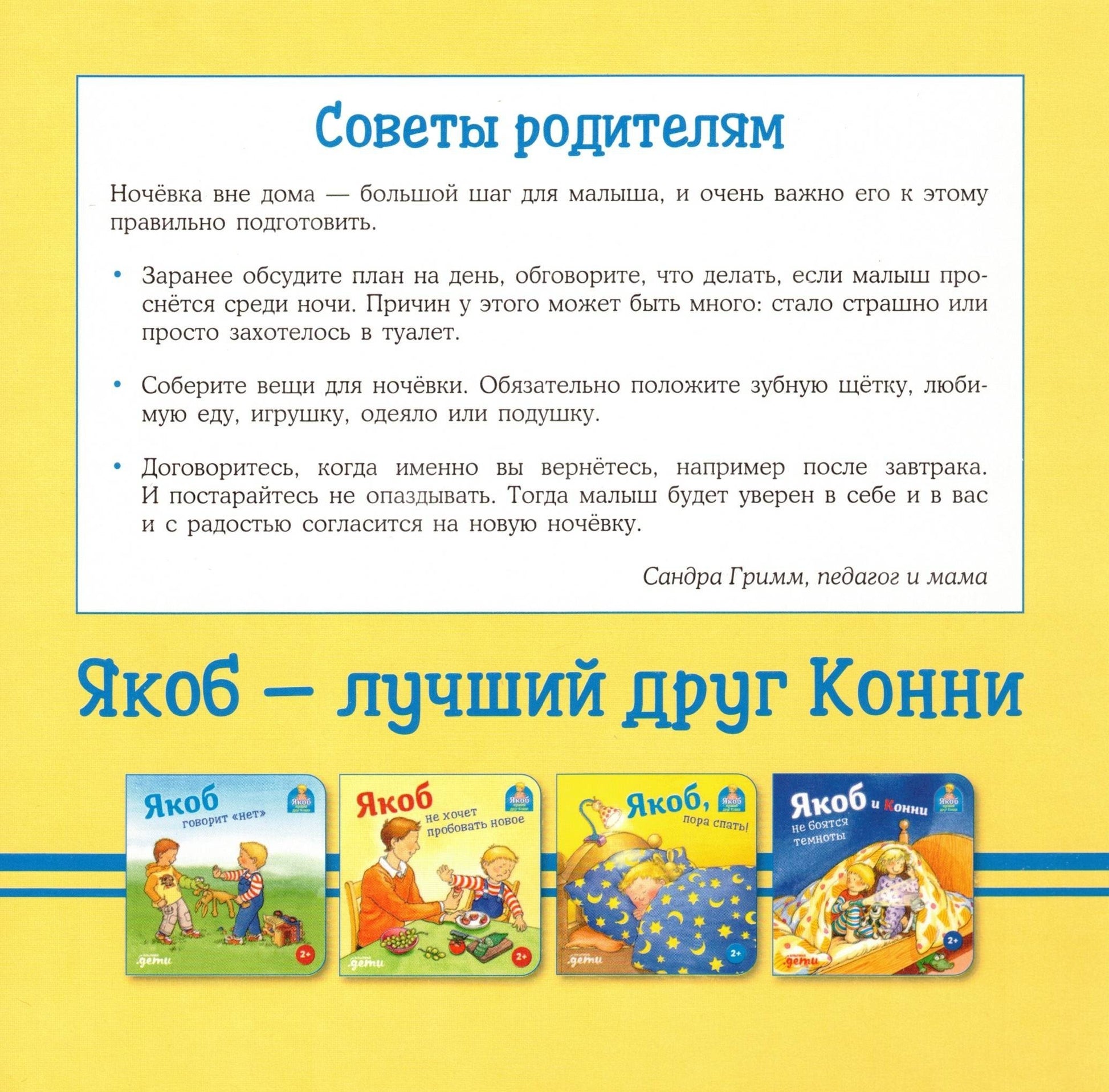 Малышам очень важно знать, что всё идёт по плану, а родители и другие близкие люди готовы позаботиться о них. Ночёвка у бабушки с дедушкой может стать отличным приключением, если подготовиться к ней заранее. Например, так, как это сделала мама Якоба: дала ему с собой любимую игрушку, привычную зубную щётку и предупредила, когда вернётся за ним. А Якоб ещё дома придумал, что будет делать у бабушки с дедушкой.«Сегодня Якоб первый раз приехал к бабушке с дедушкой на ночёвку.