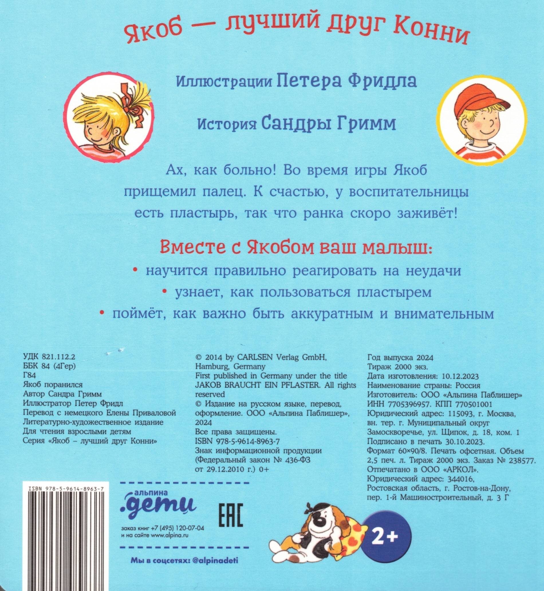 Ах, как больно! Во время игры Якоб прищемил палец. К счастью, у воспитательницы есть пластырь, так что ранка скоро заживёт!Книга выполнена из плотного картона, страницы имеют скругленные углы для удобства и безопасности маленького читателя.Подходит для совместного чтения с детьми от 2 лет и старше.